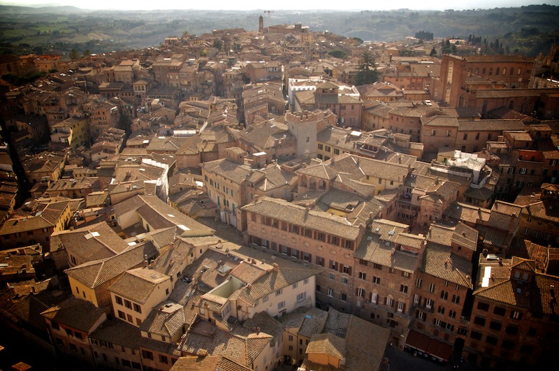 Yo y Maya decidimos subir los 84 metros de la Torre Mangia para admirar desde arriba el espectáculo de la plaza. Una experiencia inolvidable, no recomendable para quien sufra de vértigo. La escalera a espiral estrecha y empinada, el viento en la cima son solo un preámbulo del espectáculo de la cuidad desde la altura que se presenta como un paisaje de sueño.